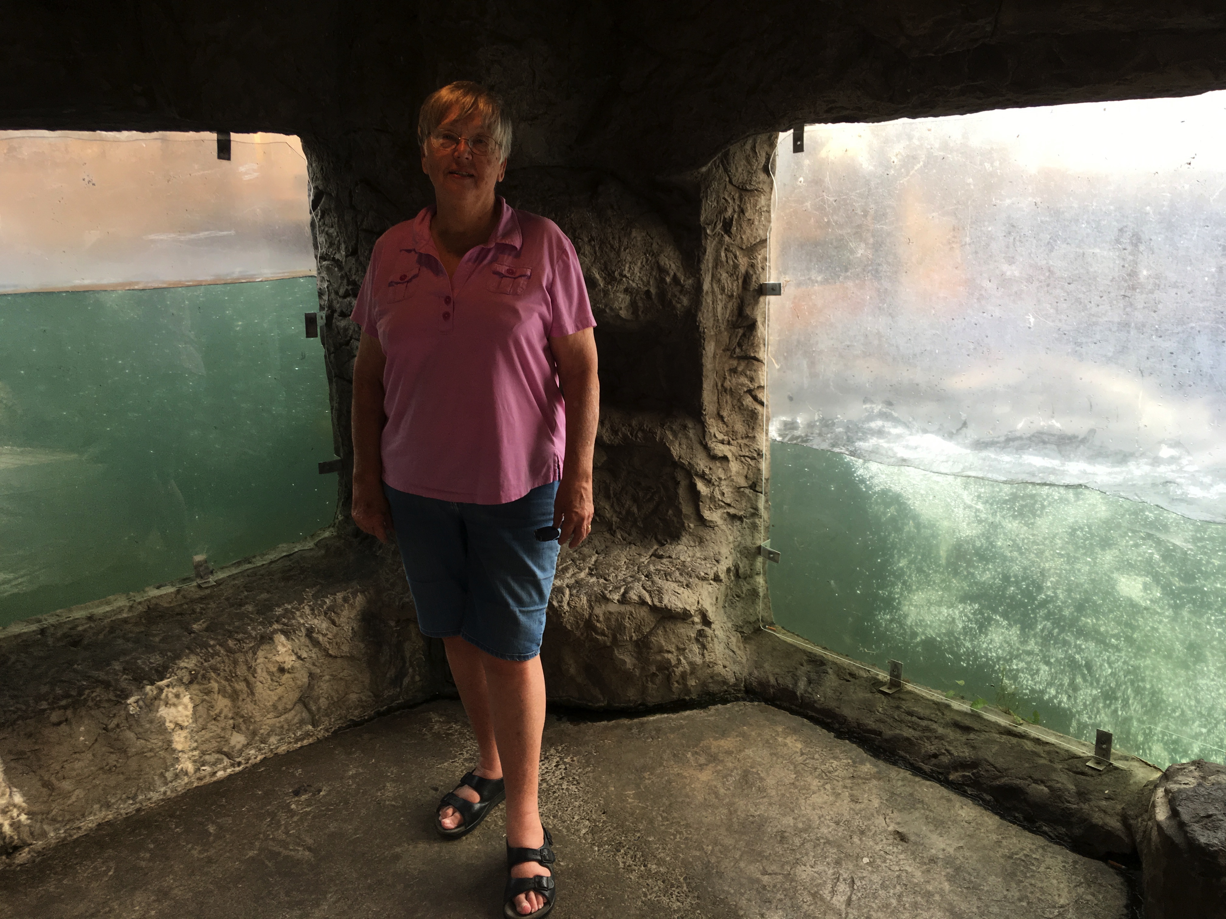 Inside the viewing room where, if the fish were running, you can watch them swim by and make the jump. Notice that the water is lower on the right side with the ‘waterfall’ turbulence at the point where the fish jump up to the next level.