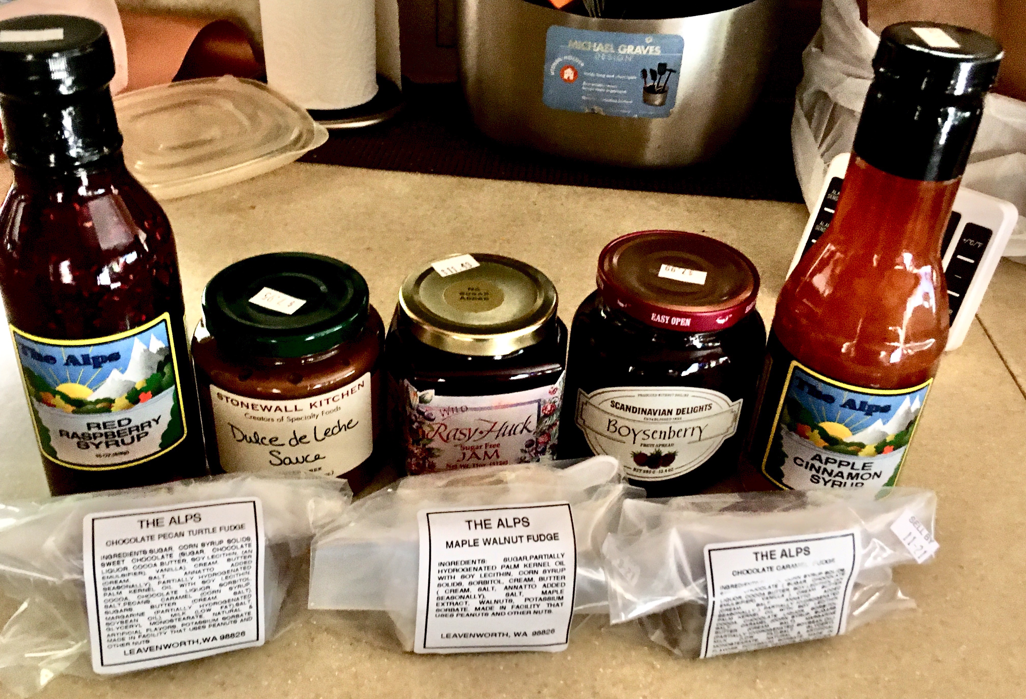 Wine wasn’t the only thing we purchased during our stay - we stopped at a little store north Leavenworth call The Alps on Highway 2.   Our sweethooth was in high gear as we pursued several of their offerings, with the results shown in this picture.